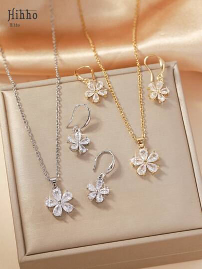 Hihho 3 件套不锈钢链花吊坠项链和耳环套装,镶嵌闪亮锆石,女士珠宝,有金色和银色可供选择,最佳礼物 - 花朵 - 查看 3