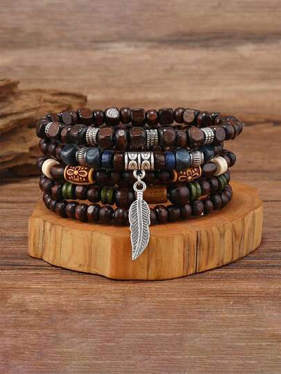4/5 件/套复古波西米亚男士手链可调节木珠手链波西米亚堆叠套装节日羽毛叶饰物珠宝,多层手链套装,圣诞节新年情人节节日派对礼物,适合男女 - 彩色 - 查看 1