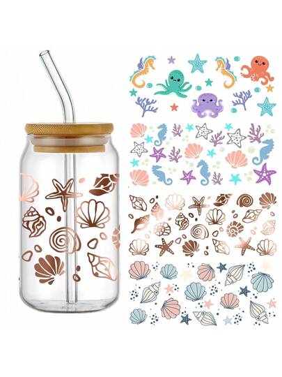 4 包海洋贝壳主题自粘塑料杯包装,UV DTF 防水防刮 3D 水晶贴花适用于玻璃器皿 - 高品质海洋生物图案装饰贴纸 - 彩色 - 查看 8