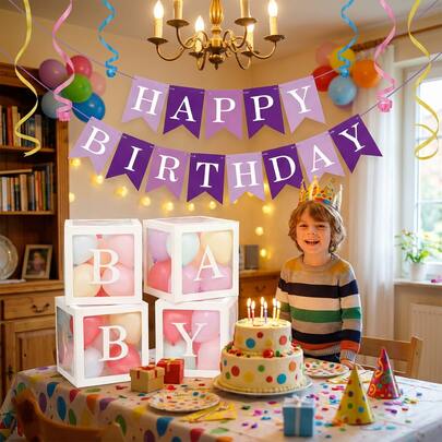 4个透明气球盒+紫色生日快乐横幅套装 | 醒目的“BABY”字母积木,生日派对装饰 | 完美适用于迎婴派对、性别揭晓派对、婚礼和单身派对 | 可重复使用的拍照背景道具 | 易于组装 - 彩色 - 查看 4
