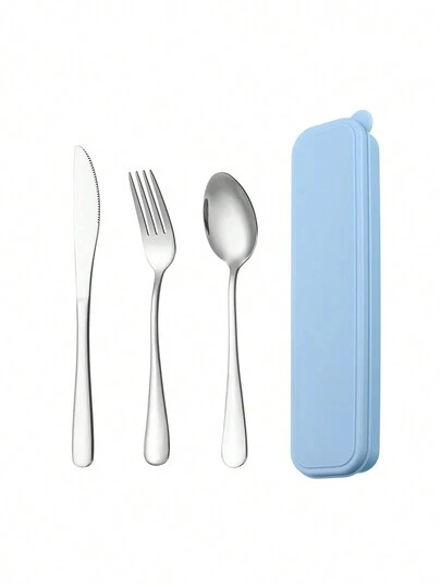 4件套便攜式不銹鋼旅行餐具套裝,包含刀、叉、匙和收納盒,非常適合辦公室、學校、野餐、露營和戶外活動