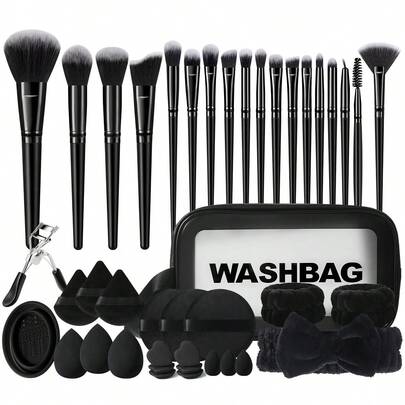 42件套化妆工具套装,包括:18支化妆刷套装+1个多功能防水拉链化妆包+1个睫毛夹+3个三角粉扑+3个圆形粉扑+1个发圈+2个手碗挂绳+3个迷你化妆海绵+6个迷你气垫粉扑+3个化妆海绵+1套化妆刷清洁工具,一应俱全,新手友好 | 方便旅行携带,送礼佳品 | 新手/女性的完美之选