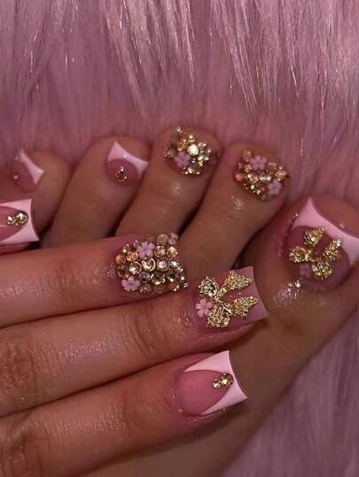 48 件/2 款粉色短方形按压式指甲套装,带闪光蝴蝶和水钻花朵图案,包含果冻胶和指甲锉 美甲用品 - 彩色 - 查看 1