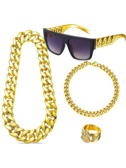 4 件套 80 年代 90 年代配饰套装女士嘻哈服装套装老式说唱歌手太阳镜仿金绳链环和手链套装派对装饰,适用于圣诞派对、狂欢派对装扮 - 金色 - 查看 1