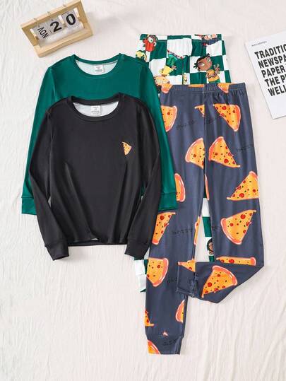 4 件套男童长袖紧身披萨和卡通人物印花休闲家居服套装,春秋 - 彩色 - 查看 1