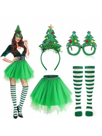 4件套圣诞条纹服装套装,蛋糕裙,角色扮演圣诞树,圣诞精灵,节日派对服装,拍照道具
