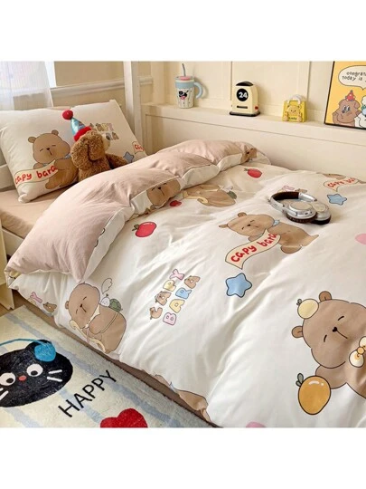 4 件套儿童床上用品套装,女孩男孩卡通水豚羽绒被套套装,可爱水豚动物水果印花床上用品套装适用于室内装饰(1 个羽绒被套 + 1 个床单 + 2 个枕套,无填充物) - 歡慶卡皮 - 查看 3