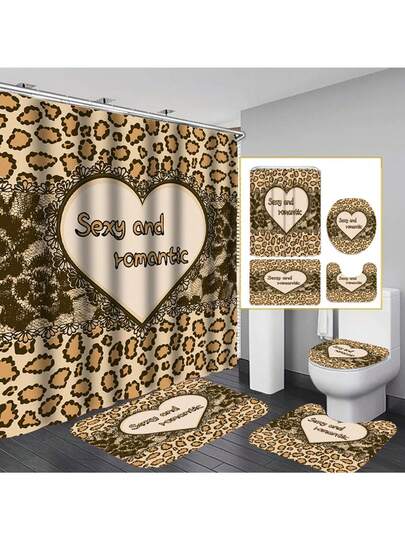 4 件套豹心印花浴室套裝,包括防水浴簾、防滑浴室墊、馬桶蓋、浴室墊和 12 個塑膠掛鉤、浴室配件、家居裝飾 - 駝色 - 查看 4