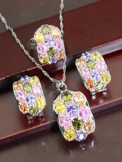 4入組奢華彩色立方氧化鋯鑲嵌耳環、戒指、吊墜項鏈珠寶套裝 - 彩色 - 查看 1