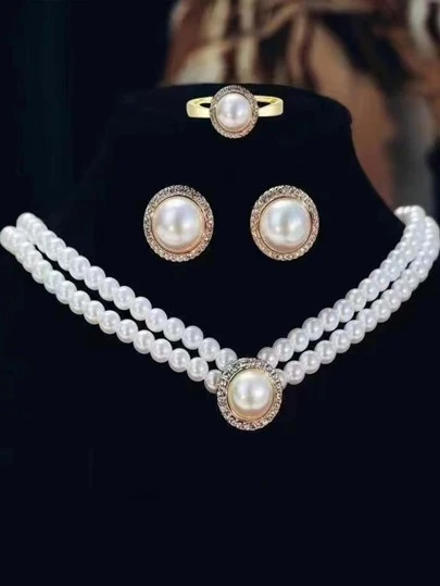 4入組奢華時尚甜美l型仿珍珠吊墜項鍊耳環戒指,女士宴會婚禮珠寶配件,友情紀念禮物 - 金黃色 - 查看 1