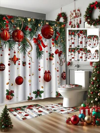 4 件套圣诞浴室装饰套装,防水节日浴室套装,带马桶座套、防滑地毯和垫子,采用涤纶织物制成,防水,带 12 个挂钩,可机洗 - 浴室配件 - 彩色 - 查看 1