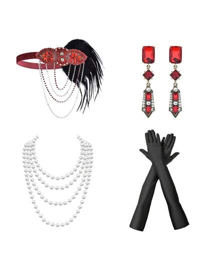 4入組/套復古鑲嵌鑽石和黑色羽毛頭箍配鍊掛墜仿珍珠耳環,適用於20年代派對,角色扮演裝扮