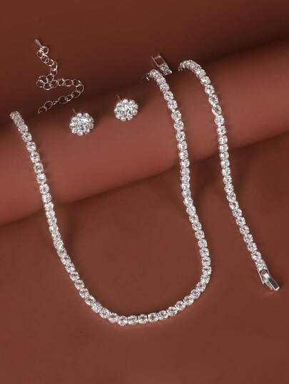 4 件套全水钻精致项链和手链首饰套装,适合女士日常佩戴 - 銀色 - 查看 1