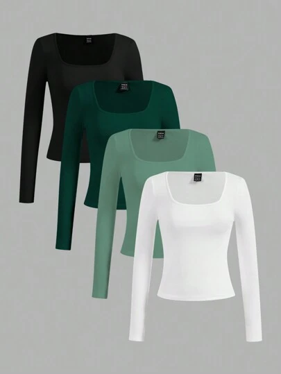 SHEIN Essnce 4 件套女士休闲方领长袖纯色百搭 T 恤,适合春秋季节 - 彩色 - 查看 4