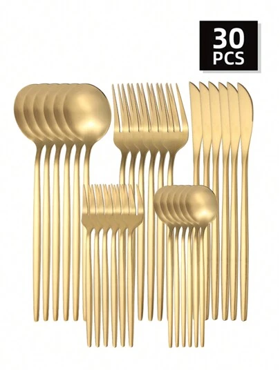 5/20/30 件不锈钢葡萄牙风格哑光餐具套装,包括牛排刀、餐叉、餐勺和茶匙、厨房、圣诞礼物 - 金色 - 查看 1