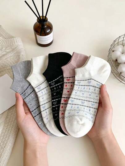 5双随机春夏费尔岛蝴蝶结装饰女士短袜,防滑 - 彩色 - 查看 1