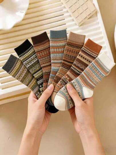 5双女士复古条纹加厚保暖袜,费尔岛图案,中筒长度,秋冬季,随机款式