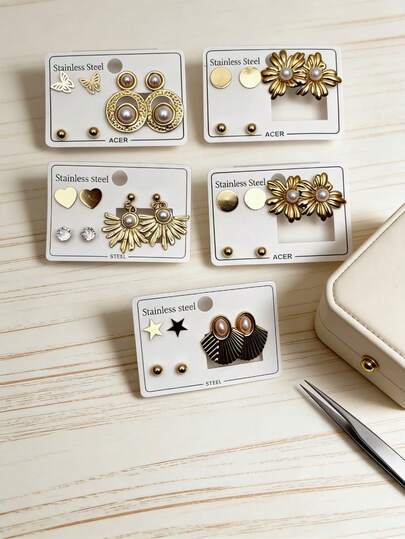 5款金色不锈钢耳环套装,珍珠和花卉设计(随机款式,3对、6对、9对) - 彩色 - 查看 10