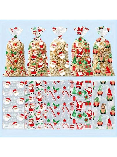 50 个圣诞糖果袋,带有圣诞老人、雪人、树木图案,透明可重复密封 PP 材料,坚固的包装适合节日派对,圣诞袜填充物,耐用且防锈 - 彩色 - 查看 1