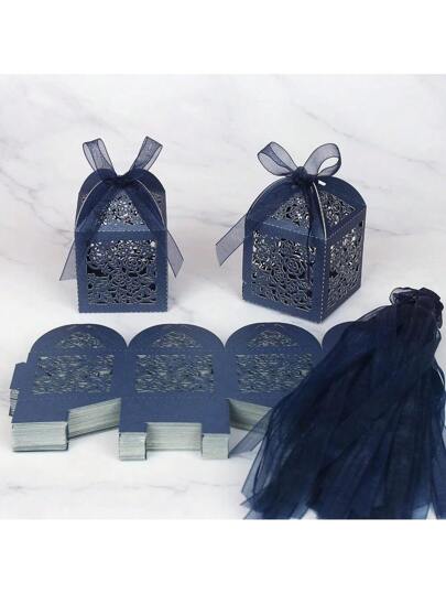 50 件/套激光切割婚礼礼品盒、带丝带和标签的糖果盒、派对礼品盒、迎婴派对、新娘送礼会、包装盒、婚礼装饰用品(海军蓝)情人节 - 深藍色 - 查看 1