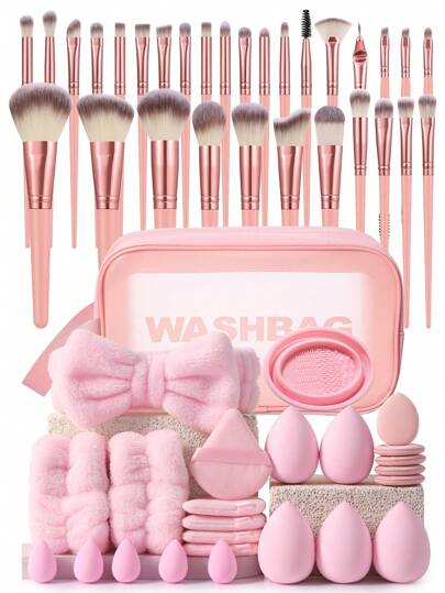 55件套化妆刷组合套装,包含眼影刷、眉刷、粉底刷、散粉刷、腮红刷、遮瑕刷和高光刷,采用超柔软优质合成毛,适合日常面部妆容。 - 粉色 - 查看 10