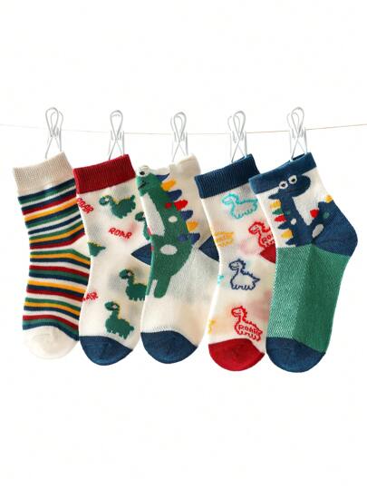 5雙男孩條紋圖案和卡通恐龍圖案中筒襪適用於日常 - 彩色 - 查看 1