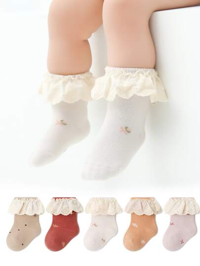 5雙/包 春季秋季嬰兒透氣蕾絲中筒襪 - 彩色 - 查看 5