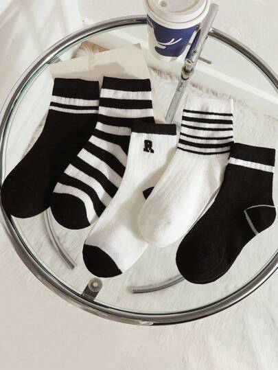 5雙女性條紋和字母圖案透氣休閒中筒襪適用於日常生活 - 彩色 - 查看 1