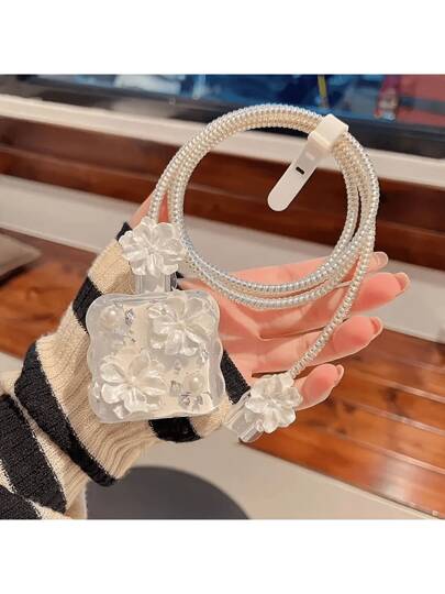 5 件/套珍珠白 3D 花卉树脂珍珠手机充电保护器,1 米电缆整理器,兼容 12/13/14 和 20w 快速充电器适配器,数据线固定器,防断裂,TPU 充电器保护壳 - 無色 - 查看 3