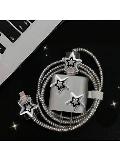 5 件套星形/心形/天使英式数据线保护套,适用于 Apple 充电器和数据线,兼容高达 20W 的 充电器,防止断裂 - 656五角星-銀-白 - 查看 5