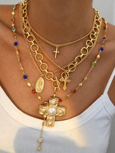 5件套复古朋克中世纪十字架水钻镶嵌耶稣肖像几何OT锁仿珍珠项链Y型链多层项链套装,适合基督徒女性日常、节日、约会、派对佩戴