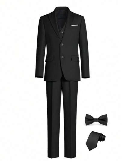 5件套男童黑色套装,修身五件套正式礼服套装,儿童燕尾服婚礼套装,幼儿男童外套配马甲、裤子、领带和领结 - 黑色 - 查看 5