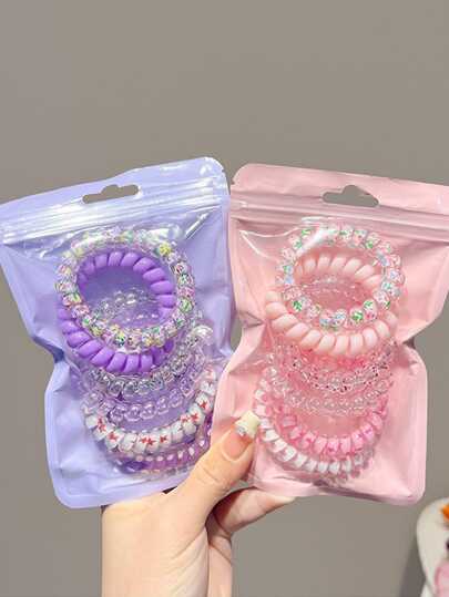 6/12 件粉紫色花朵和星星印花线圈发带、粉色配饰、马尾辫、发圈、发绳马尾辫夹 - 彩色 - 查看 6