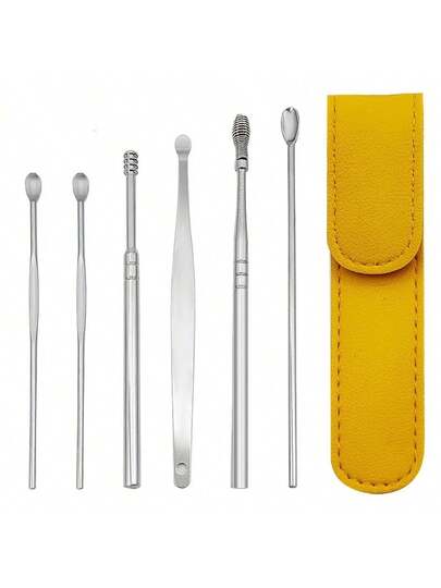 6 件組耳垢清除套件,挖耳工具耳朵清潔工具套裝,成人可重複使用耳朵清潔器便攜式耳垢清潔工具不銹鋼套裝 - 黃色 - 查看 6
