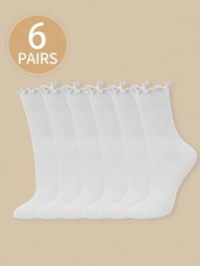 6 双女式荷叶边白色休闲中筒袜,百搭,秋冬款 - 白色 - 查看 1
