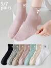 1/5/7 双(随机混合)女士彩色可爱蝴蝶结装饰休闲运动中筒袜,柔软透气,适合夏秋季日常穿着