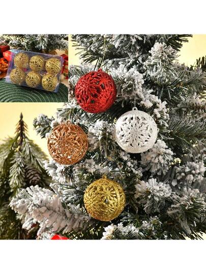 6件6厘米塑料空心圣诞树挂饰,金粉闪光圣诞球,家居圣诞树装饰,派对吊坠,舞会氛围装饰,门窗装饰,适合节日装饰和房间派对,圣诞节的最佳选择;注意:本产品为手工艺品,有轻微污垢、灰尘、油墨印刷和胶水溢出。金粉可能会脱落。本产品出现小划痕属正常现象,不影响外观和使用。