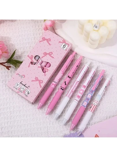 6支芭蕾蝴蝶结描边笔ST速干中性笔粉色心形按压黑笔学生卡通印花笔黑色替换芯 - 彩色 - 查看 6