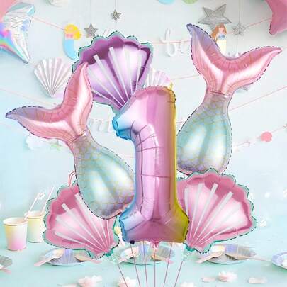 6件套美人鱼主题数字套装,包括美人鱼尾巴、数字0-9、粉色贝壳、紫色贝壳,适合儿童生日、生日派对、朋友聚会、美人鱼主题派对、海洋主题派对,室内/室外拍照道具。 - 彩色 - 查看 7