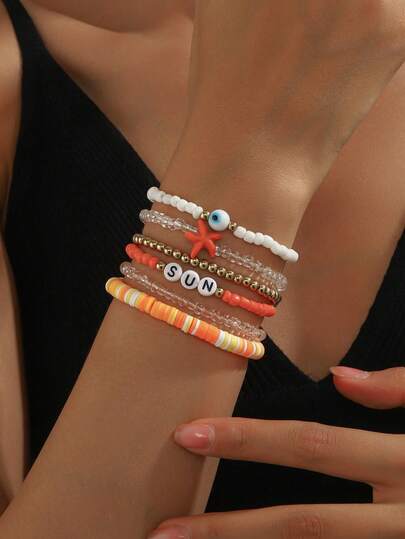6件套休闲度假风仿绿松石海星串珠手链套装,适合女性日常、度假、冲浪等场合佩戴 - 彩色 - 查看 1