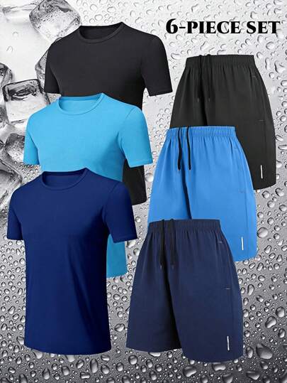 6件套男士夏季篮球训练跑步服、吸湿排汗短袖T恤和短裤套装、户外沙滩冲浪服