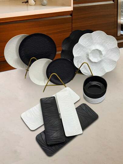 6 件套石质餐具套装,简约黑白盘子和碗,厨具 - 彩色 - 查看 6