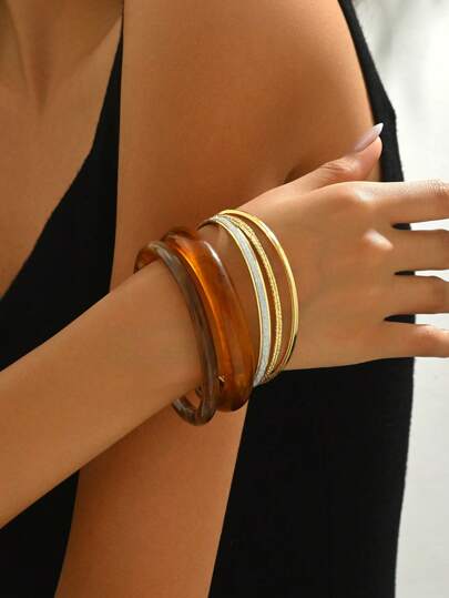 6 件/套复古风格女士亚克力树脂和金属手镯(随机颜色和图案) - 棕色 - 查看 1