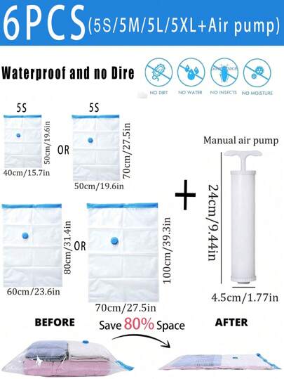 6个装透明真空压缩袋带泵,便携式塑料旅行节省空间工具,大容量家居衣物整理密封袋,多功能真空密封袋,秋季衣物收纳袋,旅行压缩袋,透明PVC压缩袋,防虫,防霉,透明,PP材质,大容量,返校季,秋季装饰 - 彩色 - 查看 24