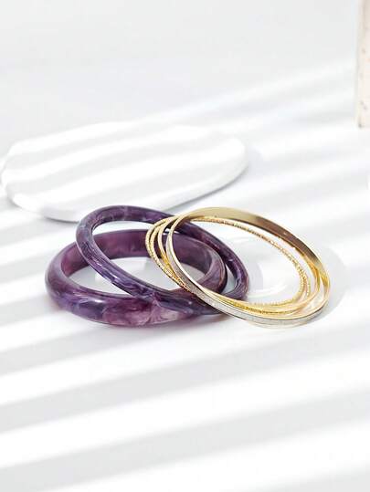 6件套女士优雅亚克力树脂金属手镯套装,适合日常佩戴(颜色和图案随机)
