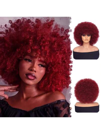 70年代非洲风情刘海假发,女士卷发假发,蓬松卷曲非洲风情假发,高品质合成大号非洲风情假发 - 酒紅色 - 查看 1