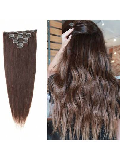 7pc/Set Clip In Human Hair Extension High Quality Clip Hair Extension Real Soft Human Hair Natural Black - 棕色 - 查看 1