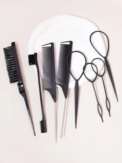 8 件套发型设计工具套装,包括 2 件法式编织工具、2 件鼠尾梳、1 件梳理刷、1 件用于发型设计的边缘刷发刷、刷子、发刷、边缘刷、刷头发、发梳、梳头发、顺发刷、球刷、迷你发刷、发刷套装、木梳 - 黑色 - 查看 1