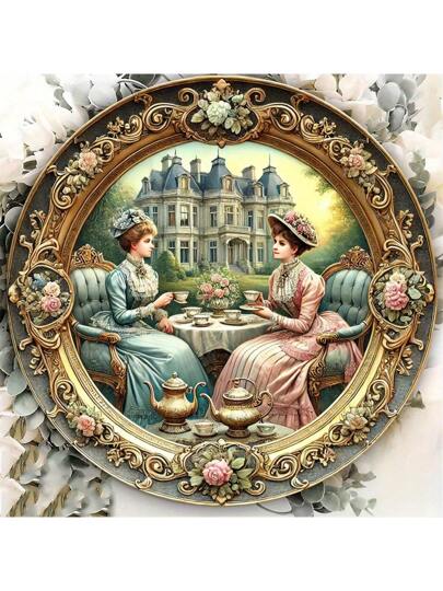 8x8英寸圆形复古维多利亚花园茶会金属标牌,优雅女士与花园场景墙饰,适用于茶室、书房、餐厅和咖啡馆,随机孔型