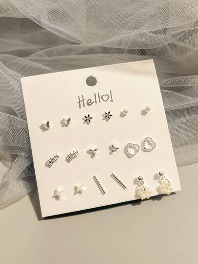 9 对小巧简约蝴蝶和全水钻皇冠耳钉套装,适合女士 - 銀色 - 查看 1